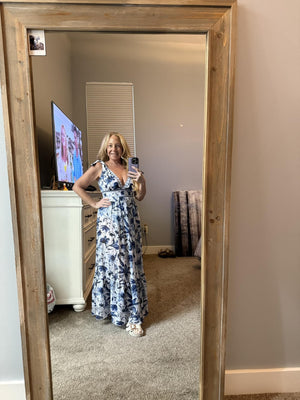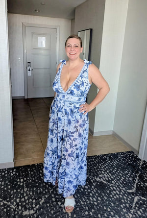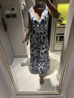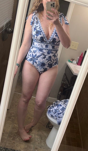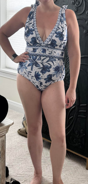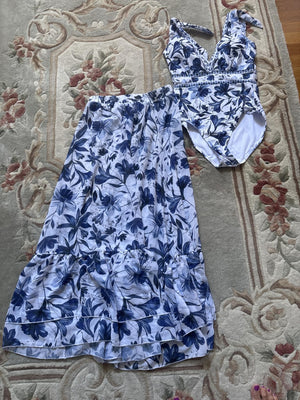Blue and White V-Neck Lace-Up One-Piece Swimsuit with Matching Skirt Sarong — Adjustable Straps & Removable Cups